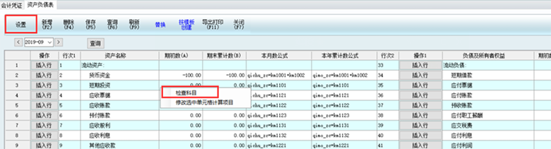 打開資產(chǎn)負債表,點擊設(shè)置按鈕,然后右擊資產(chǎn)負債表,點檢查科目,會提示哪些科目沒有設(shè)置到資產(chǎn)負債表如圖: