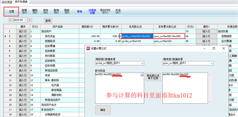 ①打開資產(chǎn)負債表,點擊設(shè)置,雙擊貨幣資金行的本月數(shù)公式,在彈出的窗口里面直接加入km1012, km代表的是科目的意思