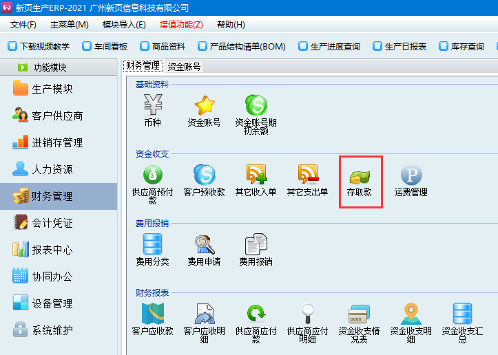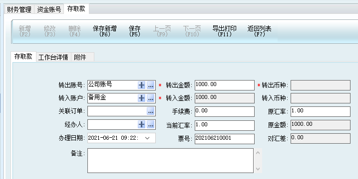 2、借款時(shí),在財(cái)務(wù)管理里面做存取款,即從公司賬號(hào)轉(zhuǎn)到備用金賬號(hào)
