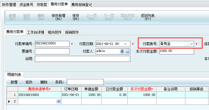 3、費(fèi)用報(bào)銷(xiāo)時(shí),在費(fèi)用付款賬號(hào)選擇備用金賬號(hào)