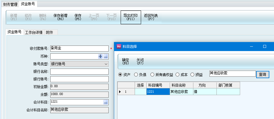 1、在財(cái)務(wù)管理的資金賬號(hào)里面創(chuàng)建一個(gè)備用金賬號(hào),備用金賬號(hào)關(guān)聯(lián)會(huì)計(jì)科目“其他應(yīng)收款”