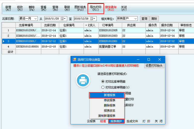 1、點擊菜單欄導(dǎo)出打印-報表維護-新增報表