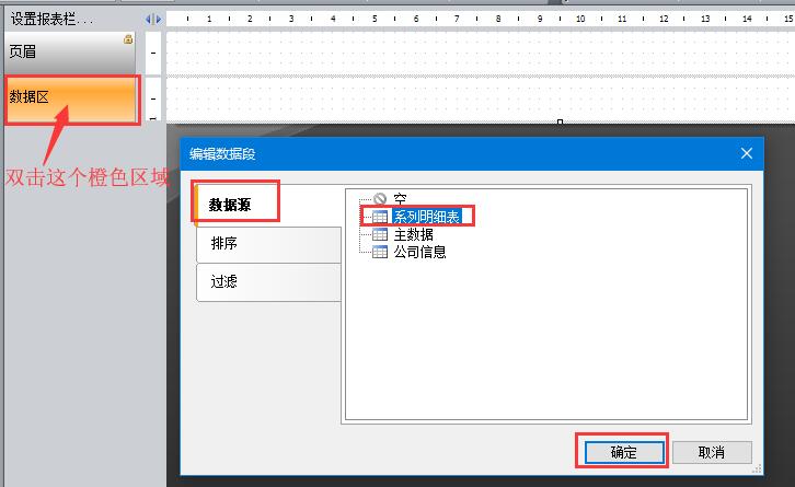 5、雙擊數據區(橙色區域),在彈出的窗口中,點擊數據源,再點擊系列明細表,點擊確定。