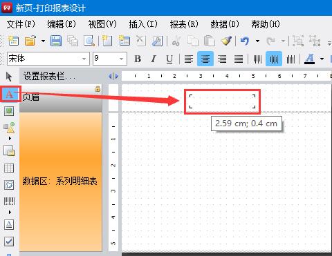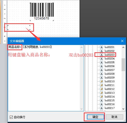 14、雙擊文本框,在彈出的窗口中輸入“商品名稱:”,然后雙擊bs00203(參照右側的字段對應名稱,可見商品名稱的字段為bs00203)
