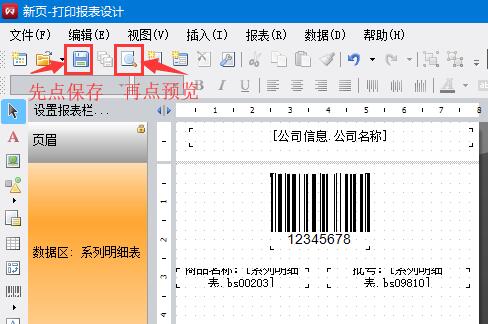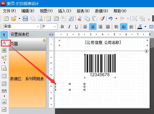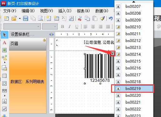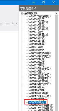 12、點擊條碼右上角的黑色三角形,參照右側的字段對應名稱,可見條碼的字段為bs00219。
