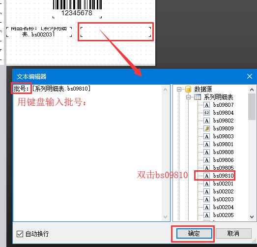 15、按照第14步的方法,添加批號、生產日期等內容,例如在彈出的窗口中輸入“批號:”,然后雙擊bs09810(參照右側的字段對應名稱,可見批號的字段為bs09810)