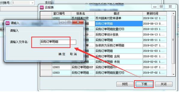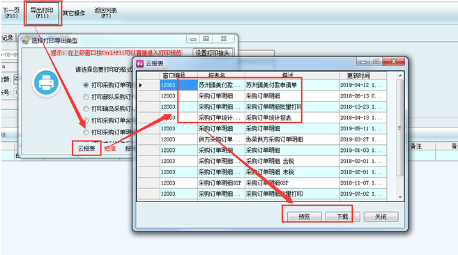⑴ 導出打印-云報表-預覽報表-預覽-選擇合適的報表下載-確定
