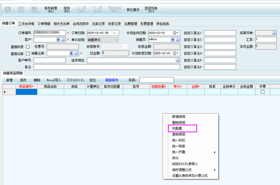 右鍵點擊明細數據的空白地區后,選擇點開列配置,在彈出窗口中查看明細數據對應的字段名。