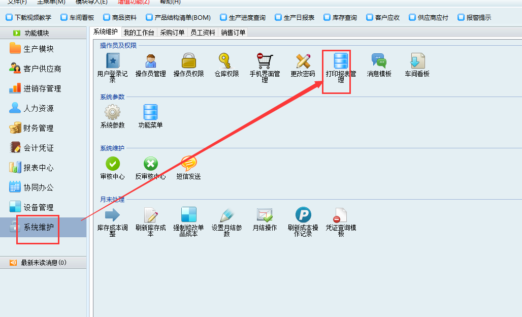 1.在新增或者修改過特定報表的賬號里,點擊系統維護-打印報表管理。