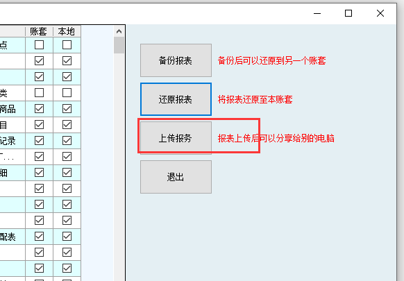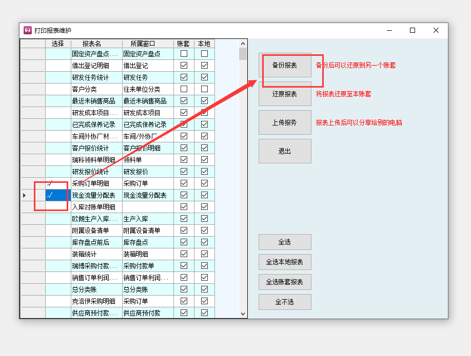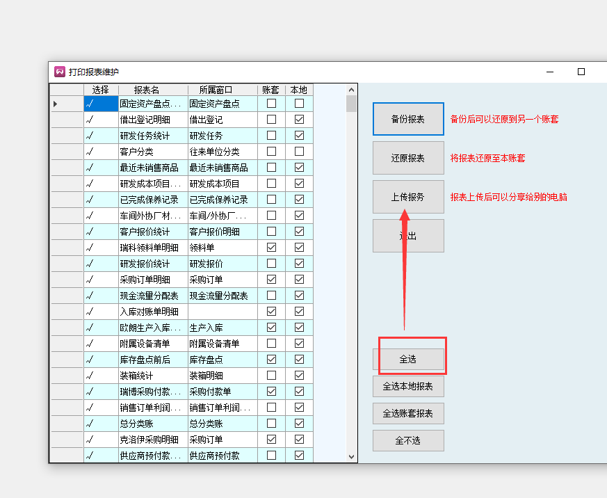 4.勾選要傳到另外一個賬套的報表(可以勾選全部,但是等待時間比較久,建議只勾選需要傳到另一個賬套所需的報表即可),點擊備份報表,可以備份在桌面。