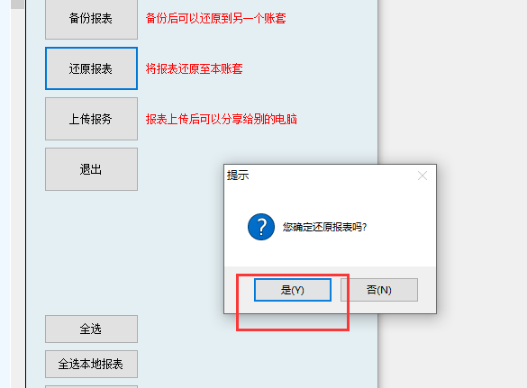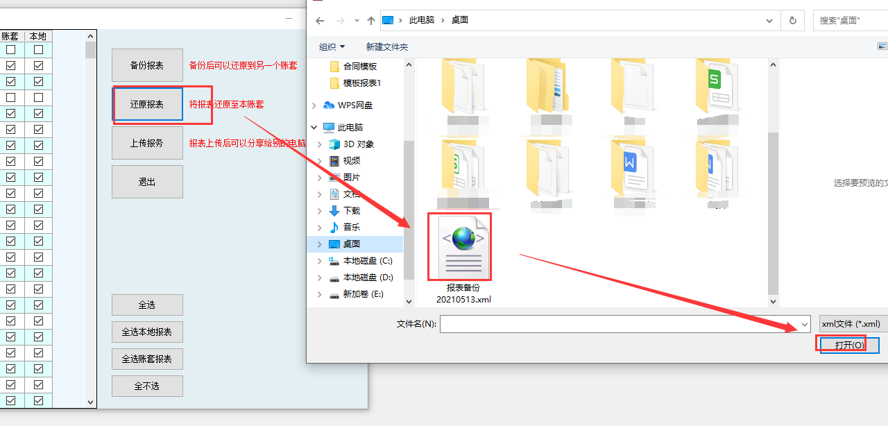 5.切換到沒有該報表的賬套,點擊還原報表,找到之前放在桌面的文件,打開。