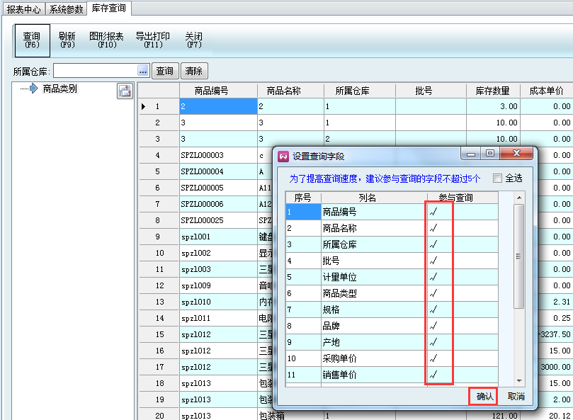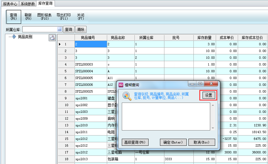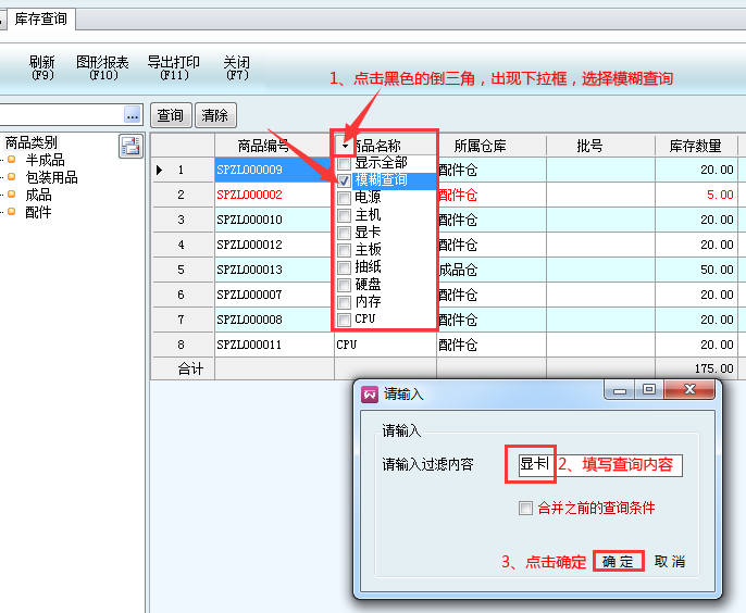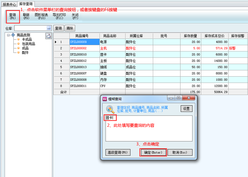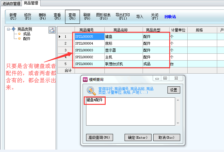 軟件大部分模塊都有查詢功能,有三種查詢方法:快速查詢、F6簡單查詢、模糊查詢(下拉篩選)。