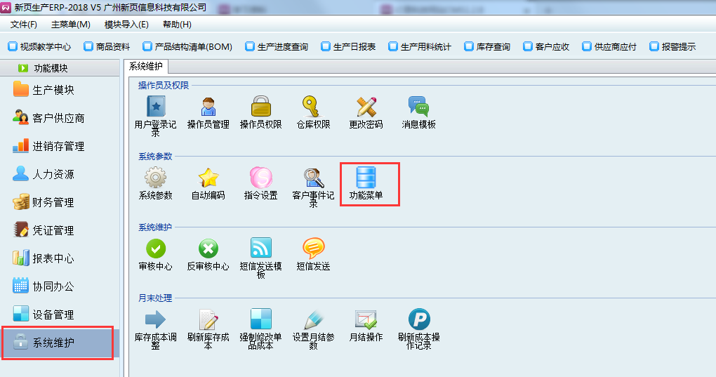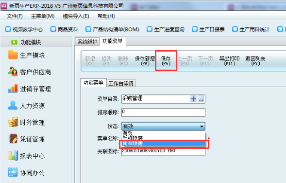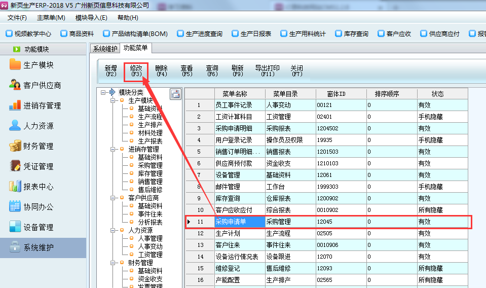 2、在功能菜單里面找到你想要關閉的功能,例如這里以關閉采購申請單為例,選中采購申請單,點擊菜單欄的修改按鈕