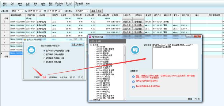 ②在訂單里面, 選擇導(dǎo)出打印里面的短信,初次發(fā)送,請(qǐng)?jiān)O(shè)置短信模版。模版的設(shè)置可以引用字段,在左側(cè)列表有相關(guān)字段說(shuō)明,如訂單編號(hào) 就用 [bs00302]。