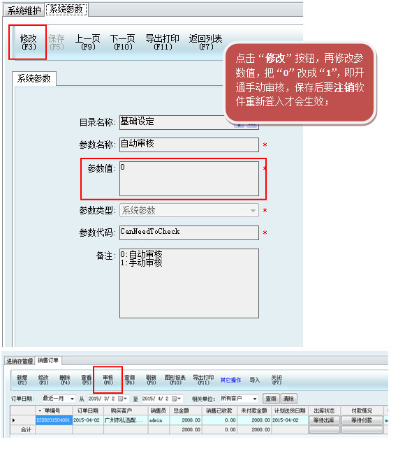 2.所有業務模塊,如采購訂單、銷售訂單等,在保存后都會顯示“審核”按鈕,點擊審核,即使單據生效,“反審核”則使單據不生效。