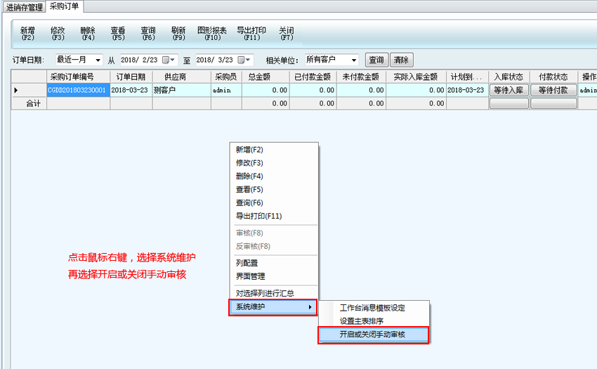 1、以采購訂單開通手動審核為例。需在采購訂單列表任意處點擊鼠標右鍵,選擇系統維護--開啟或關閉手動審核。