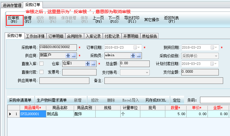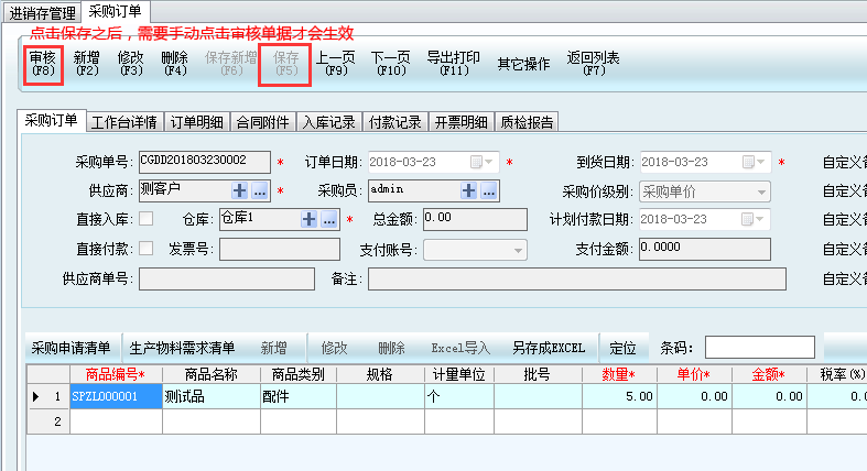 4、重啟軟件之后,下達采購訂單,點擊保存后,需要點擊審核,這個采購單才生效。反審核意思為取消審核。
