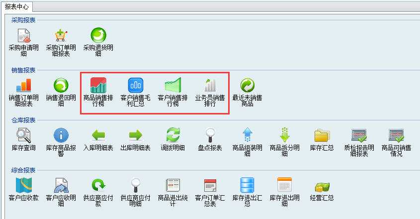 1、商品銷售排行榜、客戶銷售毛利匯總、客戶銷售排行榜、業務員銷售排行榜