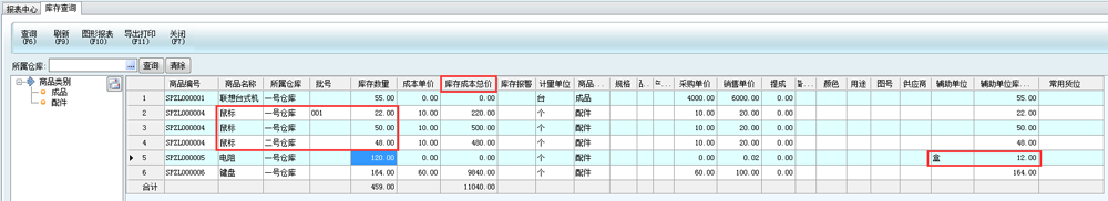 C、 如果商品有輔助計量單位,可以顯示輔助單位庫存,如下圖所示,電阻有庫存120個(12盒)