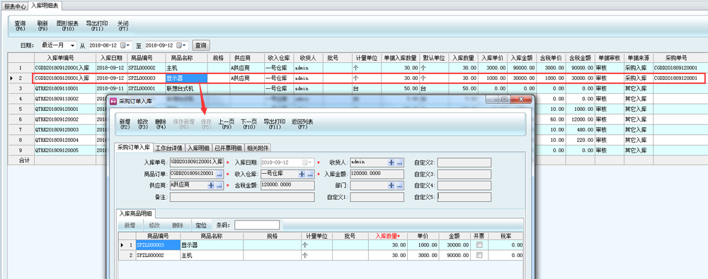 如果想查看某個明細對應的訂單,雙擊這條明細,則可以穿透查看這個訂單,如下圖3,雙擊第二條明細,可以查看到這張采購訂單(出庫明細表操作一樣)