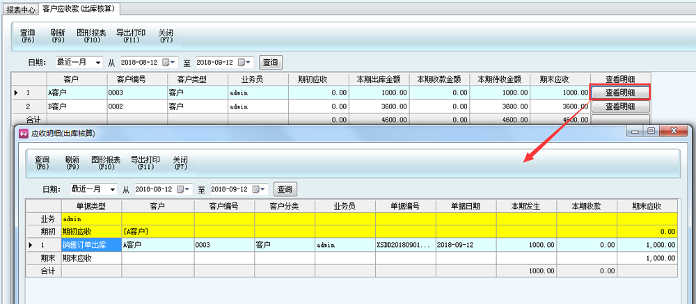 客戶應收款、供應商應付款報表可以查看待收款的金額和明細,例如下圖,點擊查看明細,可以看到A客戶有一張銷售出庫單產生一筆1000元的金額未收