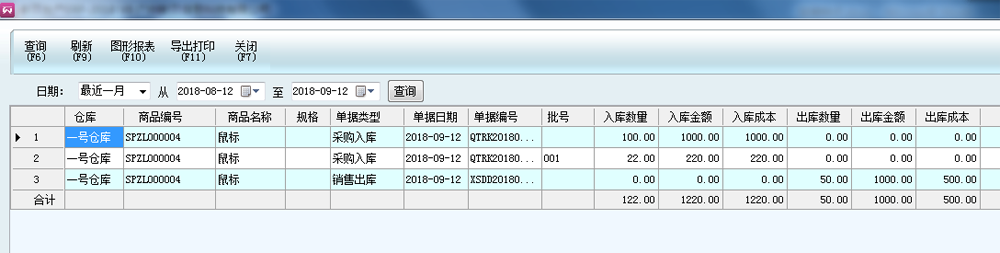 可以查詢某個商品或全部商品的進出庫明細,如下圖,選中商品,然后就可以看到這個商品在某個時間入庫了一批,在某個時間出庫了一批。