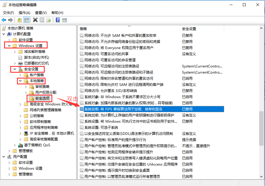 3、點擊“安全選項”后在右側窗口中找到“系統加密:將FIPS兼容算法用于加密、哈希和簽名”設置,然后雙擊它。
