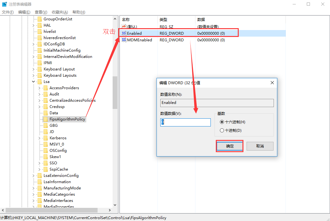 3、在右側窗口中雙擊“Enabled”數據數值改為0為禁用FIPS。