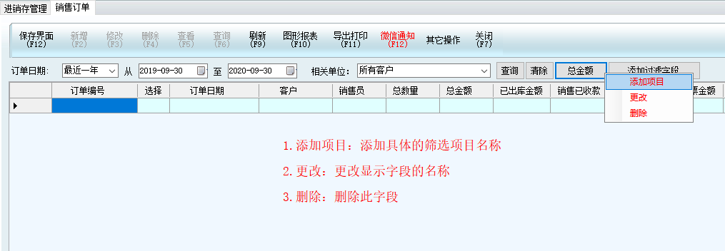 4.5 設置完成,保存界面,重新打開銷售訂單,點擊總金額,即可出來篩選條件。
