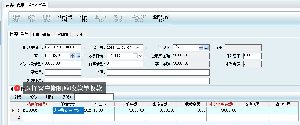 ②收到客戶期初欠款,在【進銷存管理】-【銷售收款單】進行收款