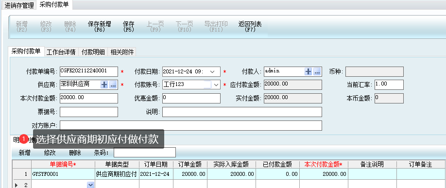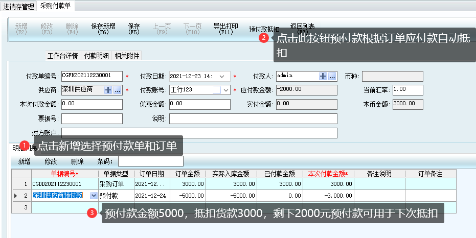 ①支付預(yù)付款:還沒下達采購訂單,先預(yù)付貨款給供應(yīng)商,在【財務(wù)管理】-【供應(yīng)商預(yù)付款】里面操作,比如預(yù)付款貨款5000元