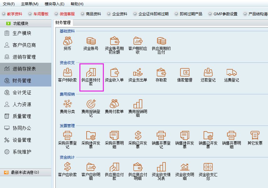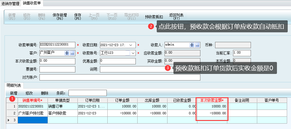 ①收到預(yù)收款:還沒下達銷售訂單,先收到客戶預(yù)付款,在財務(wù)管理模塊里面做“客戶預(yù)收款”,比如預(yù)收貨款10000元