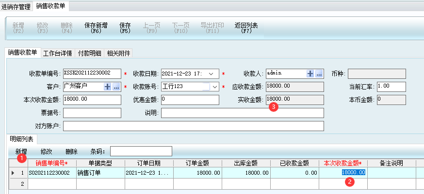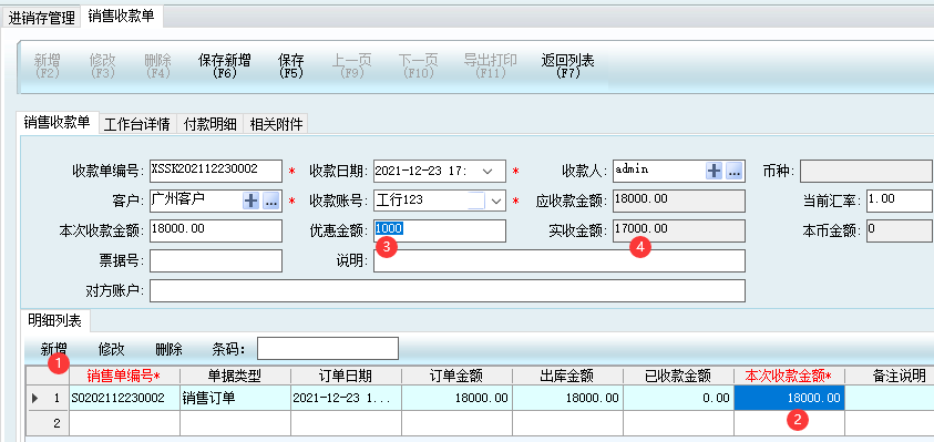 【進銷存管理】-【銷售收款單】做銷售收款時填寫優(yōu)惠金額,比如訂單貨款18000,實收17000,給客戶返利1000元