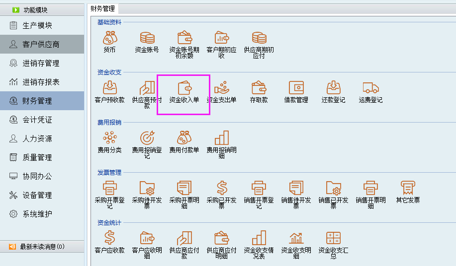(1)其他收入:包括股東投資、銀行貸款、借款、收到贊助金、現(xiàn)金盤盈等各種其他收入就在【財務(wù)管理】-【資金收入單】里面做