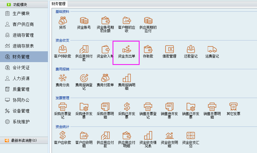 (2)其他支出:包括支付員工工資、社保、醫(yī)保、公積金、水電費,各種附加稅,員工借款,對外投資,贊助等各種其他支出就在【財務(wù)管理】-【其他支出單】里面做