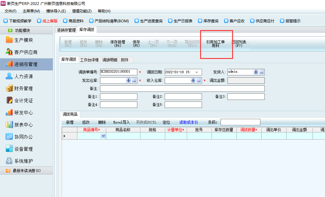 3.調(diào)撥單可以引用加工單,會(huì)帶出加工單的需求數(shù)量,即先從總倉(cāng)庫(kù)批量調(diào)到車間倉(cāng)庫(kù)