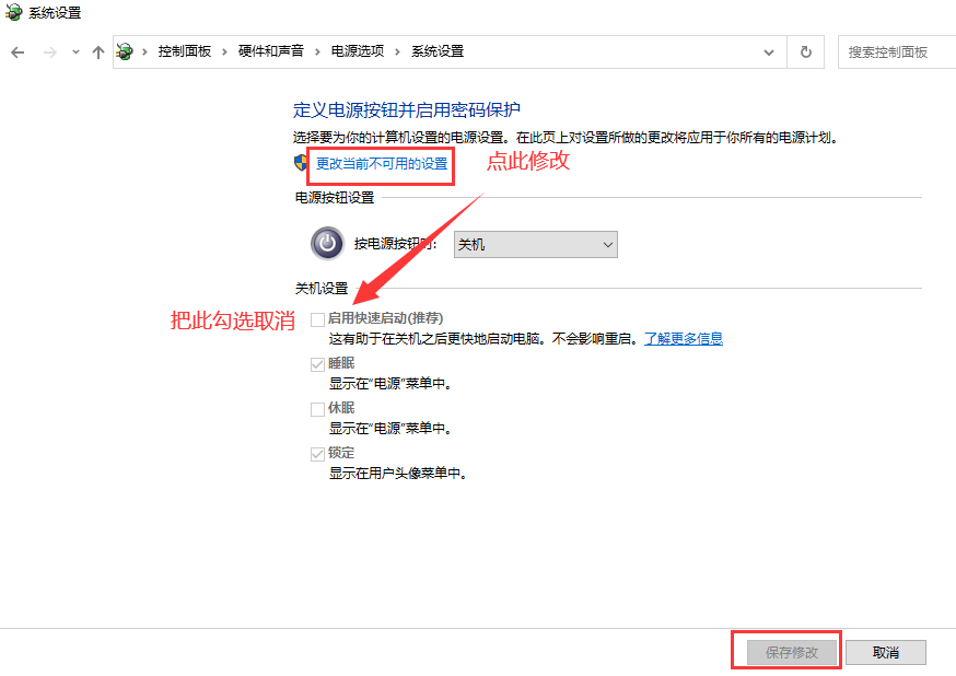 3.點擊更改當(dāng)前不可用的設(shè)置,把啟用快速啟動的(推薦)前面的按鈕,取消勾選,保存修改后,重啟電腦即可