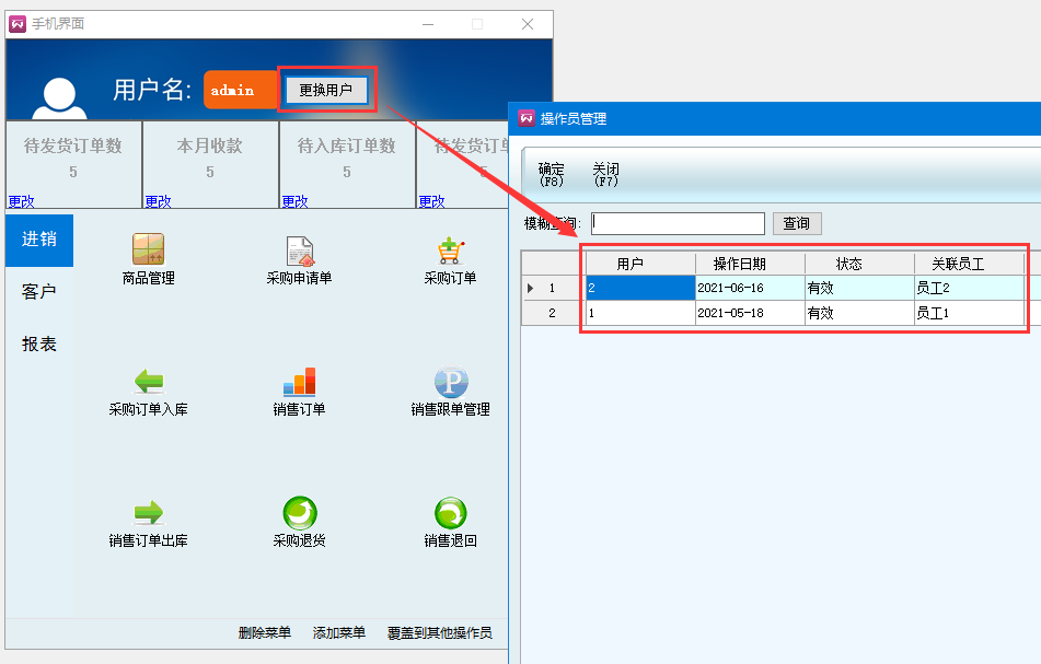 每個員工賬號都可以分開設置APP上要開通的功能,點擊更換用戶,選擇員工賬號。