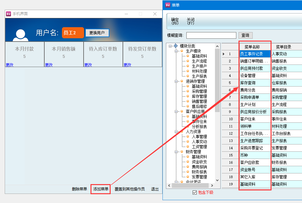添加菜單,即添加需要開通的功能,雙擊后選擇。員工登錄APP后就能查看該功能內容