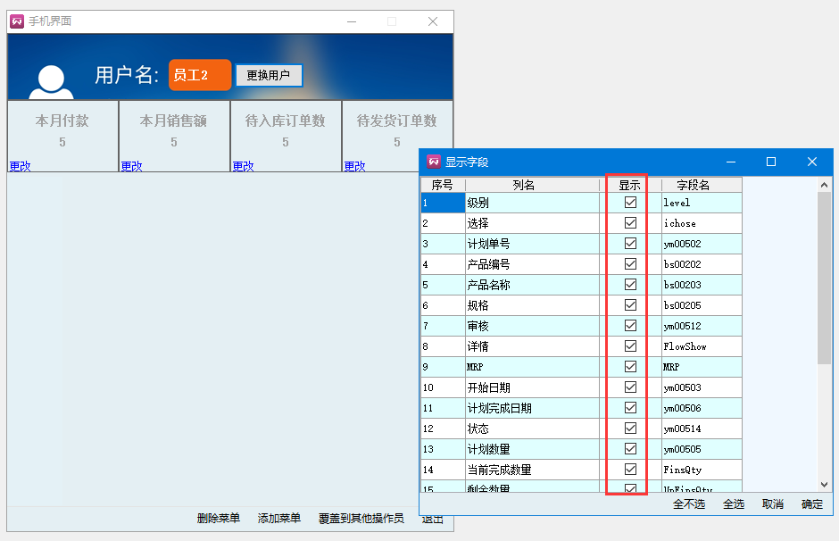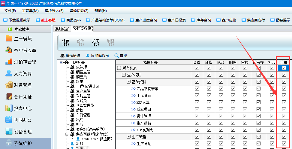 設置操作員后,在操作員權限中勾選需要開放的手機功能權限。