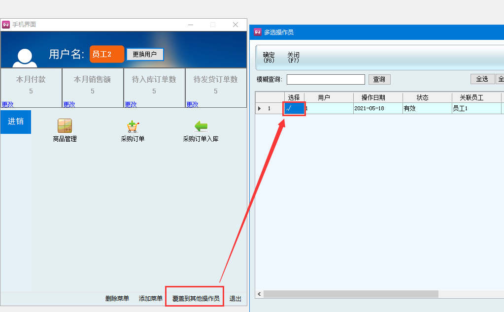 做完一個員工的授權后,如果另一個員工要開通的功能一樣,可以選擇覆蓋到另一個員工的賬號,就不用重復設置