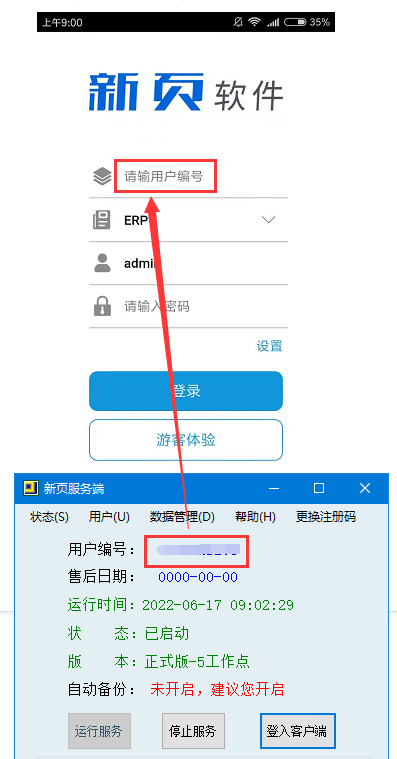 1、安裝好以后,打開軟件,進入登錄界面,提示 輸入用戶編號,用戶編號就是服務端上的用戶編號,如果是托管在我司的云服務器上的用戶,我司會提供一個編號用于登錄。
