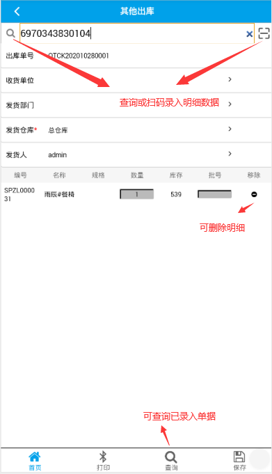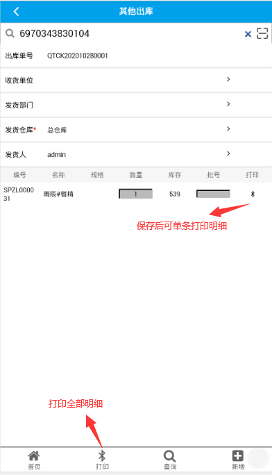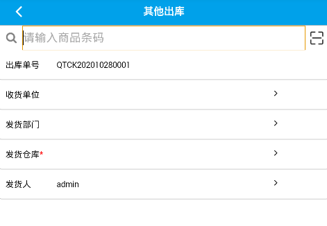 然后就會讀取到這個(gè)商品對應(yīng)的信息,如編號、名稱、規(guī)格等等,收貨單位、發(fā)貨部門、發(fā)貨倉庫、發(fā)貨人等皆可通過手動選擇。