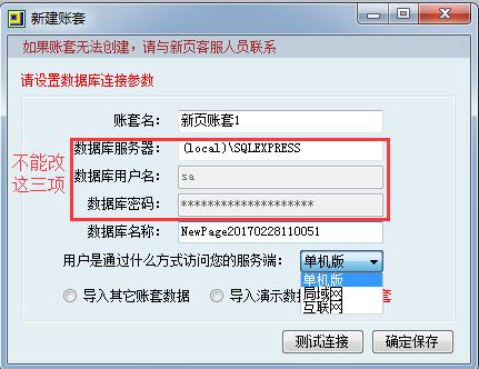 賬套名和數據庫名稱可以修改,訪問方式根據實際選擇單機版,局域網,互聯網。測試連接數據庫,提示連接成功,確定保存。提示連接失敗請咨詢客服。