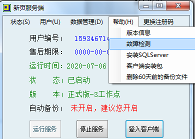 打開新頁服務端——幫助——故障檢測,檢查數據庫的運行