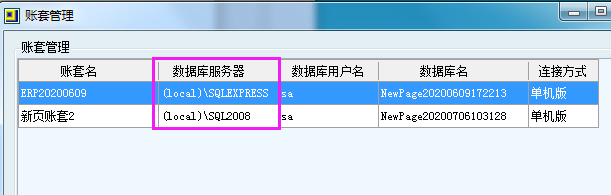 打開數據管理——賬套管理,看已有賬套的數據庫服務器,從下圖可以看到。