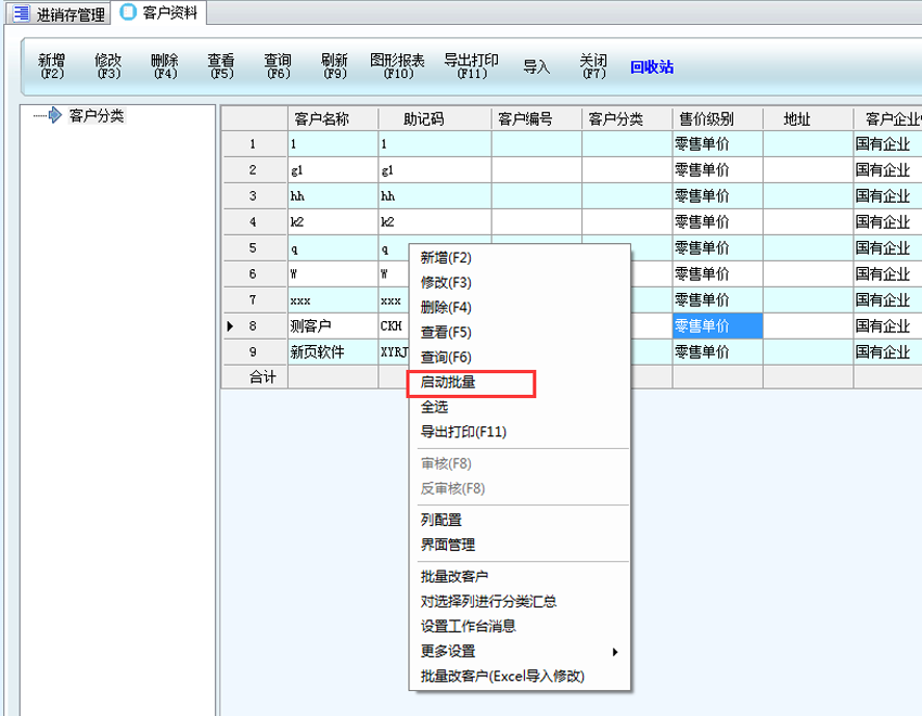 3、打開客戶資料,在客戶資料的列表中點擊鼠標右鍵,選擇啟動批量,然后再右鍵,選擇全選