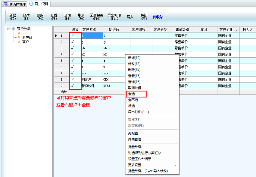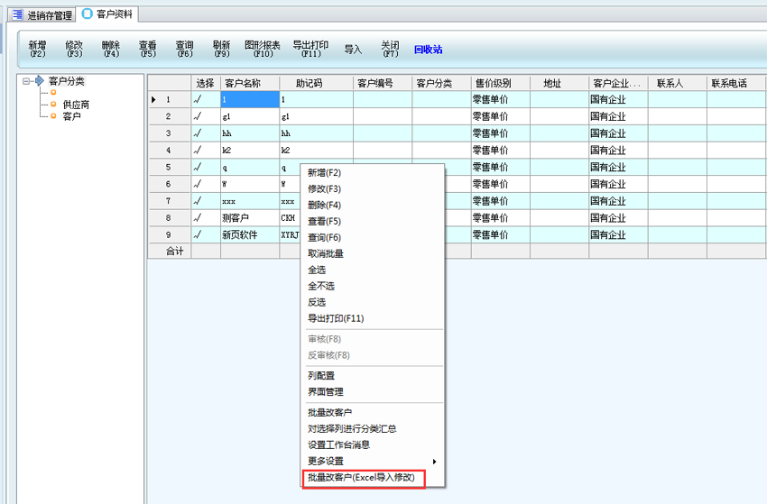 4、再點擊右鍵,選擇批量改客戶(Excel導入修改)