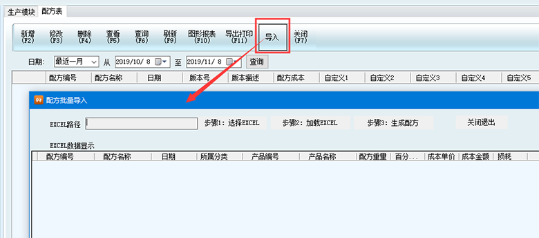2、打開生產(chǎn)模塊-配方表,點擊菜單欄導入按鈕,彈出窗口。