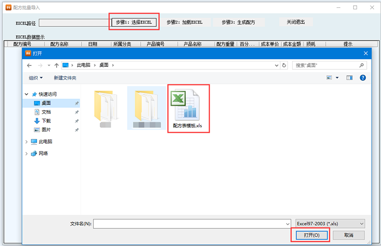 3、點擊 步驟1:選擇EXCEL,在彈出的窗口中選中剛才編輯好的excel文件,點擊打開。